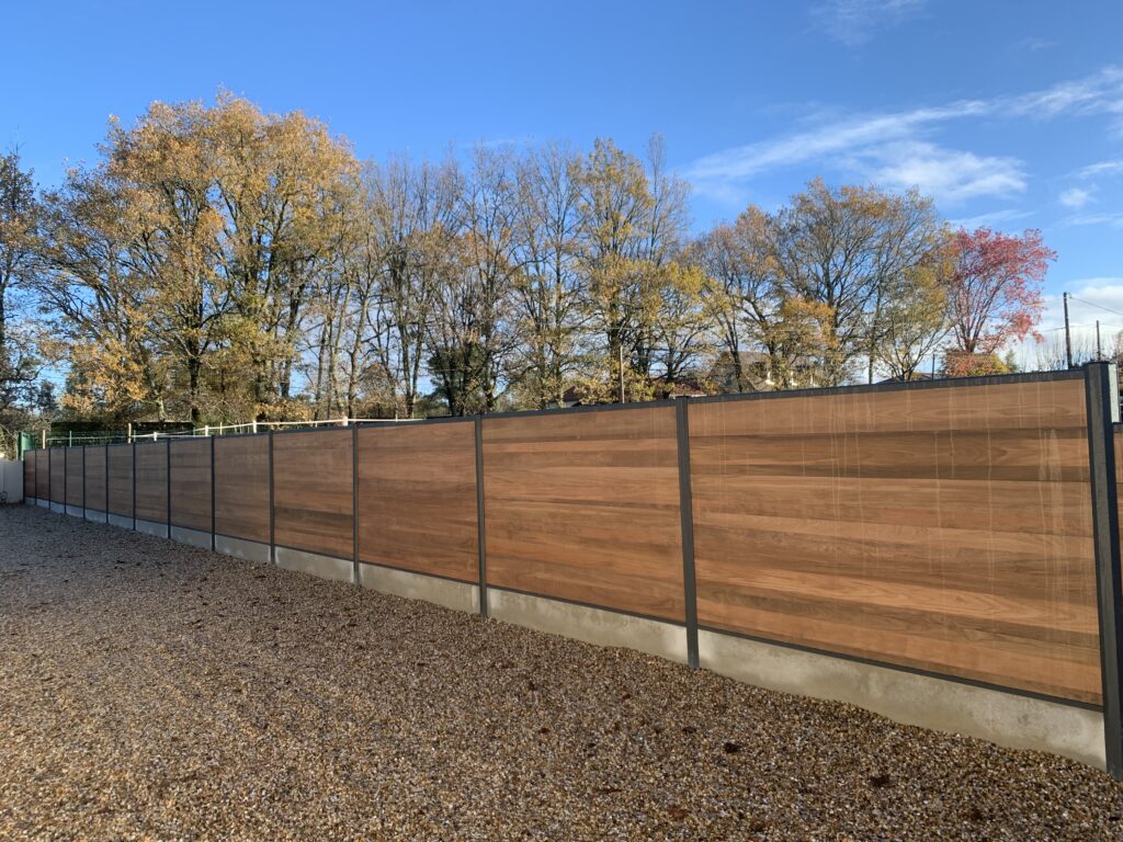 Réalisation d’une clôture Océwood sur la commune de La Force, alliant des lames composites effet bois à un cadre en aluminium noir pour un rendu moderne et tendance. L’ensemble est complété par des soubassements en béton gris, assurant robustesse et durabilité. Avant l’installation, nous avons procédé à l’arrachage complet de la haie existante, permettant une mise en œuvre propre et soignée du projet.